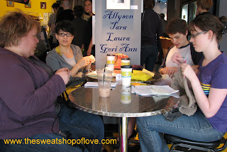 th babies, funky dressed pierced students and a few folks reading the paper. Allyson, Tara, Laura and Geri Ann were there too, sitting around a steel top table knitting, sipping their coffee and clearly solving the problems of the world. Turns out, Allyson really is, one stitch at a time. Check out her site www.thesweatshopoflove.com and see what I mean.
